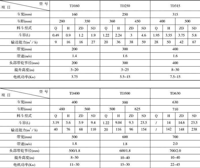 TD系列斗式提升機(jī)備有四種料斗:Q型(淺斗)、H型(弧底斗)、Zd型(中深斗)、Sd型(深斗)。